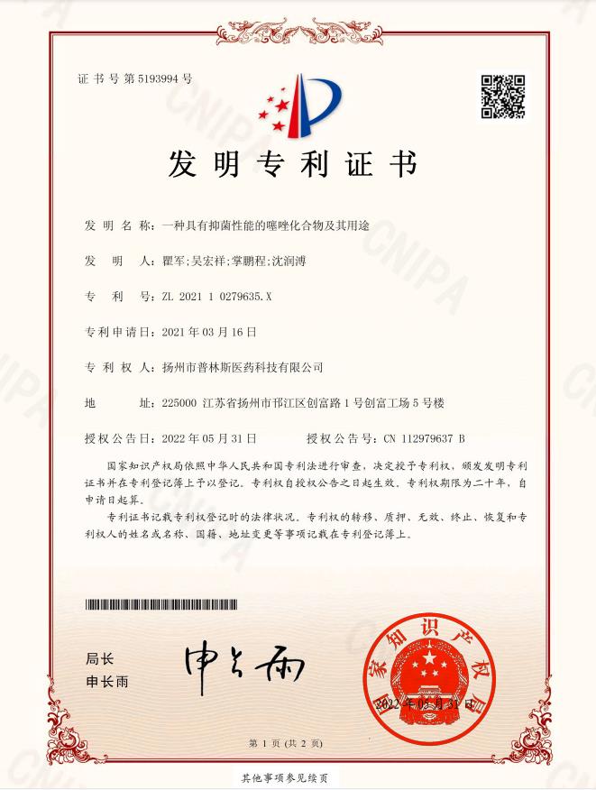 近日,聯(lián)環(huán)集團下屬企業(yè)揚州市普林斯醫(yī)藥科技有限公司申報的“一種具有抑菌性能的噻唑化合物及其用途”、“一種噻唑化合物及其用途”、“一種用于植物抑菌的噻唑化合物及其用途”、“一種抑制腫瘤細(xì)胞生長的噻唑化合物及其用途”4項發(fā)明專利,獲得國家知識產(chǎn)權(quán)局授權(quán)并取得專利證書。
